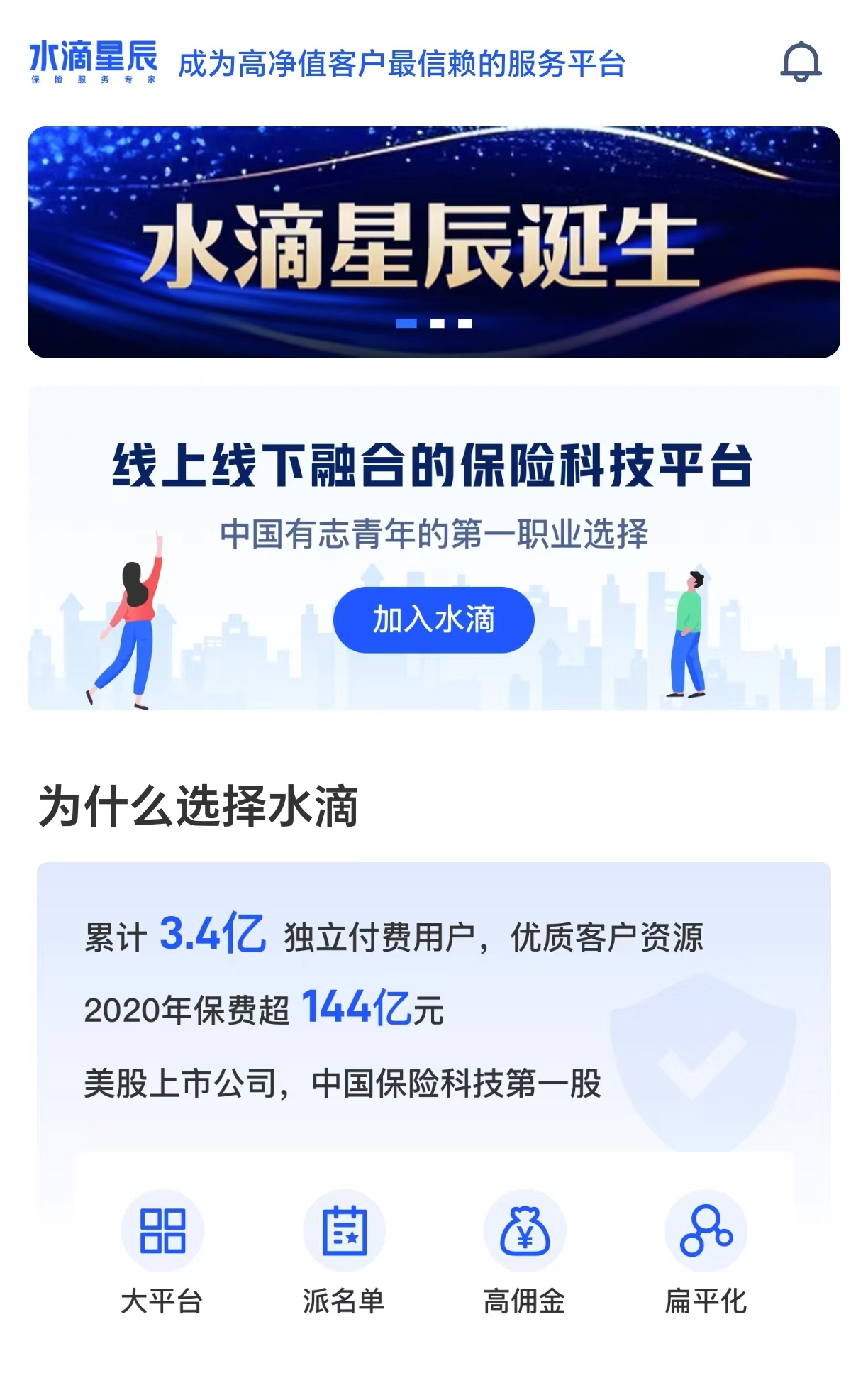水滴始终致力于为保险经纪人提供全方位的服务支持,解决保险经纪人展业过程中的各类问题,提供一整套展业交易,线索追踪,保单管理,计划书,人员管理,文章海报,培训成长等功能,让经纪人可以为用户提供更优质的服务,展业更轻松。